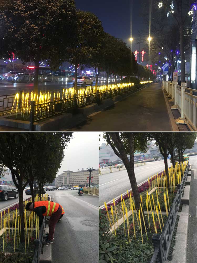 西安蓮湖區(qū)2019年元旦、春節(jié)亮化工程。項目包括鐘鼓樓燈光花籃雕塑,郵政廣場亮化、北大街主干道的亮化。采用了麥穗插地燈、郁金香插地燈、芙蓉花插地燈、小品燈球、串燈等多款造型燈具,共同打造出北大街沿線的夜景風光。