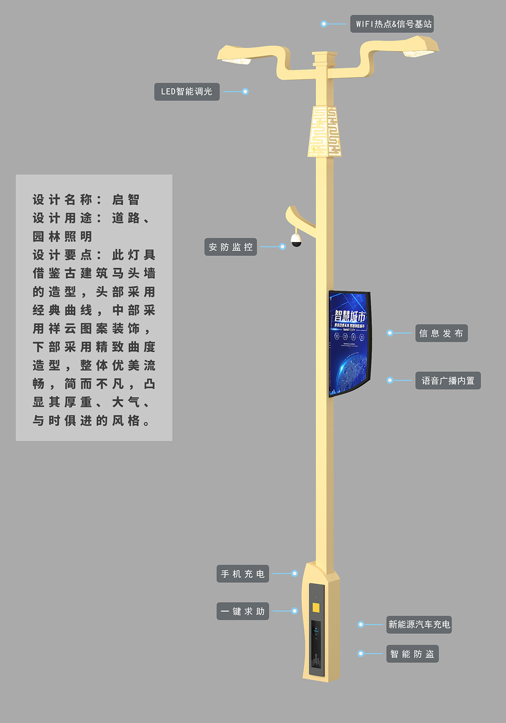 設(shè)計要點:此燈具借鑒古建筑馬頭墻的造型,頭部采用經(jīng)典曲線,中部采用祥云圖案裝飾,下部采用精致曲度造型,整體優(yōu)美流暢,簡而不凡,凸顯其厚重、大氣、與時俱進的風(fēng)格。