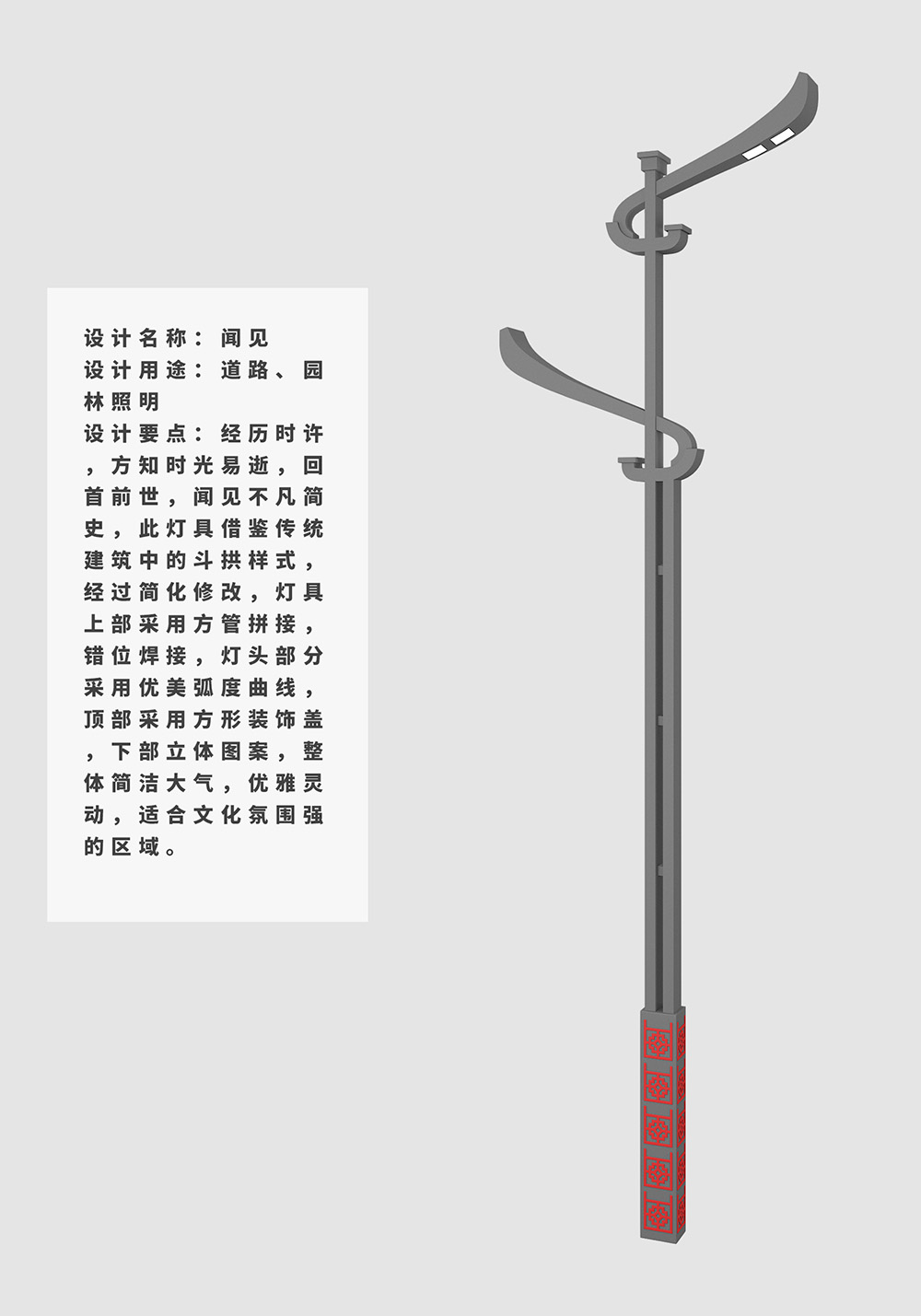設(shè)計(jì)要點(diǎn):經(jīng)歷時(shí)許,方知時(shí)光易逝,回首前世,聞見不凡簡(jiǎn)史,此燈具借鑒傳統(tǒng)建筑中的斗拱樣式,經(jīng)過簡(jiǎn)化修改,燈具上部采用方管拼接,錯(cuò)位焊接,燈頭部分采用優(yōu)美弧度曲線,頂部采用方形裝飾蓋,下部立體圖案,整體簡(jiǎn)潔大氣,優(yōu)雅靈動(dòng),適合文化氛圍強(qiáng)的區(qū)域。